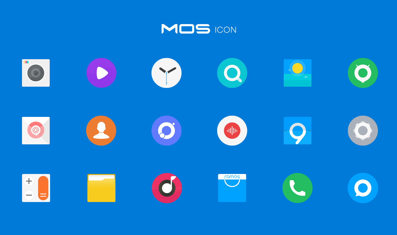 獨(dú)一無二的系統(tǒng)語言需要一個(gè)品牌化元素貫穿其中,圓形的運(yùn)用便是藍(lán)魔的獨(dú)特印記,ramos UI 重繪了超過1000個(gè)第三方應(yīng)用圖標(biāo),圖標(biāo)簡潔豐富的色彩,簡約的圖形,讓用戶一眼便注意到的同時(shí), 激發(fā)用戶的使用熱情,讓你的系統(tǒng)桌面不再被粗糙雜亂的安卓應(yīng)用圖標(biāo)所占據(jù)。